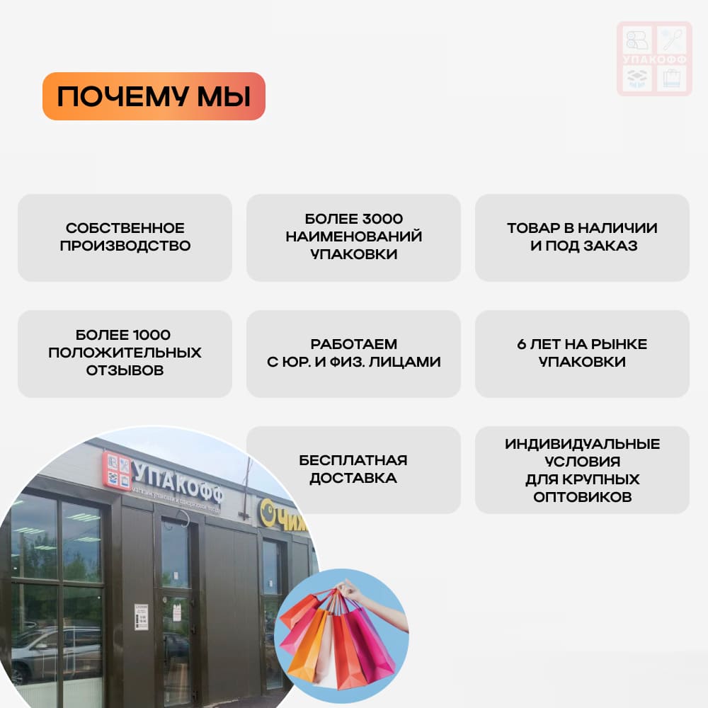 Добро пожаловать в магазин упаковки и одноразовой посуды "Упакофф" в Уфе! Мы — надежный партнер для вашего бизнеса и дома, предоставляющий широкий ассортимент упаковочных решений в трех районах города: Центр, Сипайлово и Зеленая Роща.