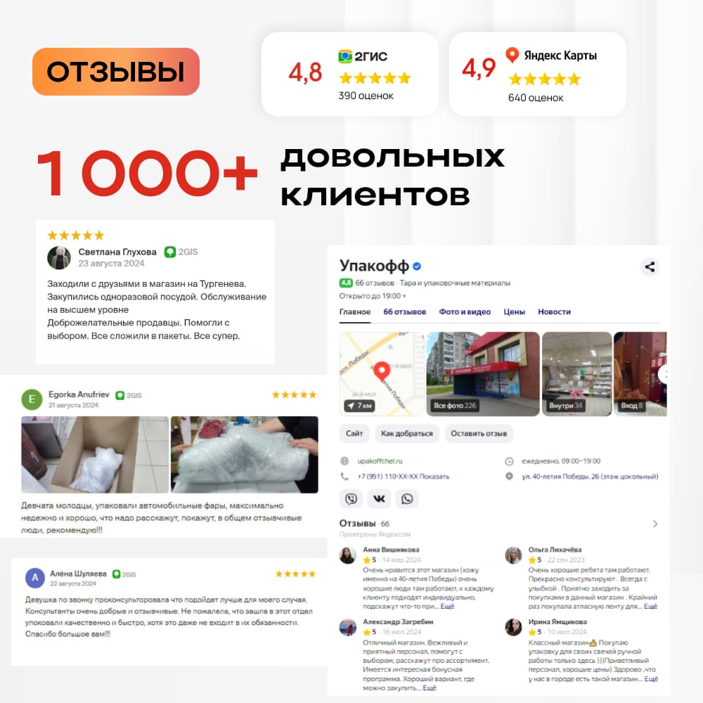 Наша компания работает на рынке более 6 лет и успела завоевать доверие тысяч клиентов по всей России. Сегодня "Упакофф" — это крупная федеральная сеть магазинов упаковки, а в Уфе мы стали одним из ведущих поставщиков упаковочных материалов и одноразовой посуды.